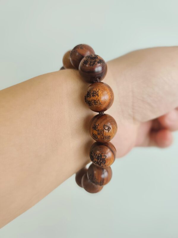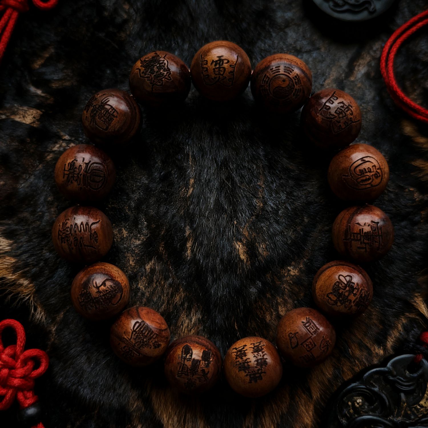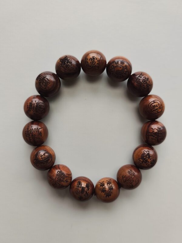 design:The bracelet is made of wooden beads split from lightning-struck wood, each of which is engraved with the twelve Taoist secret characters.
